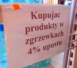 Jak zatem należałoby zredagować informację zamieszczoną na załączonym obrazku? Na przykład Kupując produkty w zgrzewkach, otrzymujesz 4% opustu albo Przy zakupie towarów w zgrzewkach 4% opustu.