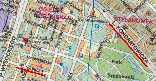 Na poniższej mapce warto zwrócić uwagę na dwie ulice (te podkreślone na czerwono): jedną z ważniejszych w całej okolicy ulicę Kondratowicza i znacznie mniej istotną ulicę Syrokomli. Cały dowcip polega na tym, iż obie poświęcone są tej samej osobie.